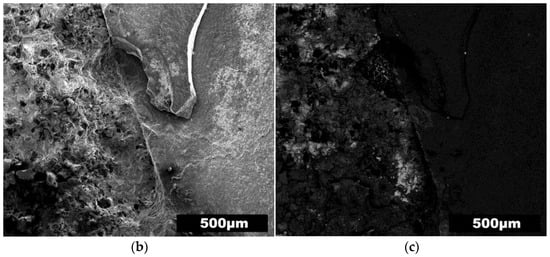 In Figure 6a, the macroscopic observation reveals that the ceramic are tightly embedded in the surrounding TWIP matrix, indicating a robust macroscopic bond. The SEM images further support this observation. As seen in Figure 6b, the secondary electron SEM morphology shows a well-defined and intimate bonding between the ceramic reinforcement and the TWIP steel matrix at the microscopic level. The tight integration of the ceramics with the metal matrix suggests a strong interfacial bond, essential for effective load transfer and composite performance. Notably, the cracks observed in the right side of the ceramic particle in Figure 6b are attributed to the sample preparation process and not the casting process, indicating the robustness of the interface under the actual manufacturing conditions. The backscattered electron SEM morphology in Figure 6c provides additional insight into the compositional differences at the interface. This image clearly delineates the ceramic and the TWIP steel matrix, showing a distinct interface region where the two phases interact.