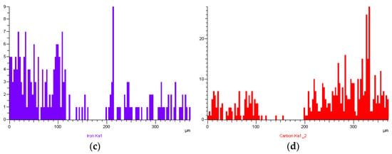 The elemental line scans in Figure 7 reveal a distinct transition zone where the ceramic and the TWIP steel matrix meet. The distributions of Fe, C, and Si across the interface indicate some degree of elemental diffusion, suggesting the formation of a transitional layer. This diffusion can enhance the interfacial bonding strength and contribute to a smoother stress transfer between the ceramic and metallic phases. The presence of a transitional layer, characterized by gradual changes in elemental composition, further confirms the good microstructural compatibility and bonding at the interface.