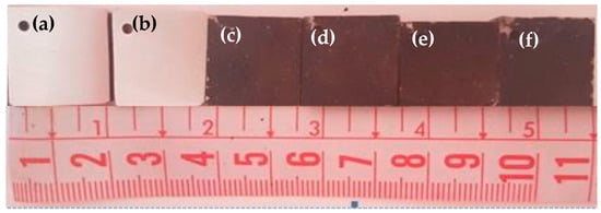 Macroscopic images of the different AZ91D samples: (a) AR; (b) silanized; (c) 0.05% 2 h; (d) 0.05% 4 h; (e) 0.1% 2 h; (f) 0.1% 4 h.