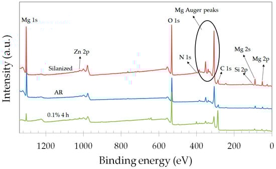 The surface chemical states of the different AZ91D samples were assessed using XPS. Figure 3 shows the survey spectra of AR, silanized, and 0.1% 4 h samples. The spectra of the pure GO and the other GO-coated samples are shown as Supplementary Materials (Figure S1). In the AR condition, the main photoelectron lines were assigned to magnesium and oxygen. Carbon was found as surface contamination (adventitious carbon), as observed by other authors for the air-formed surface oxide of magnesium alloys [,]. In the silanized sample, in addition to these species, a small silicon peak appears, as well as nitrogen. These elements are part of the APTES molecule. The spectrum of the 0.1% 4 h sample, in turn, exhibited a stronger C 1s peak and the magnesium signal was attenuated due to the presence of the GO film.