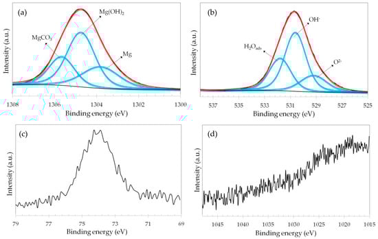 The O 1s spectrum (Figure 4b) was deconvoluted with three peaks, which were assigned to oxide-type bonds (O2−), hydroxide-type bonds (OH−), and adsorbed water (H2Oads), in agreement with the literature [,]. Hydroxide bonds predominate over oxide ones, likely due to the relatively large amount of Mg(OH)2 formed on the AZ91D surface, as Mg is the main constituent of the alloy.
