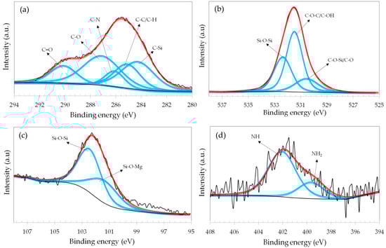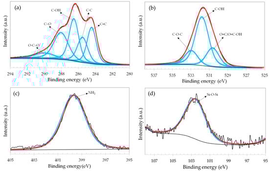 XPS high-resolution spectra of the 0.1% 4 h sample: (a) C 1s; (b) O 1s; (c) N 1s; (d) Si 2p.