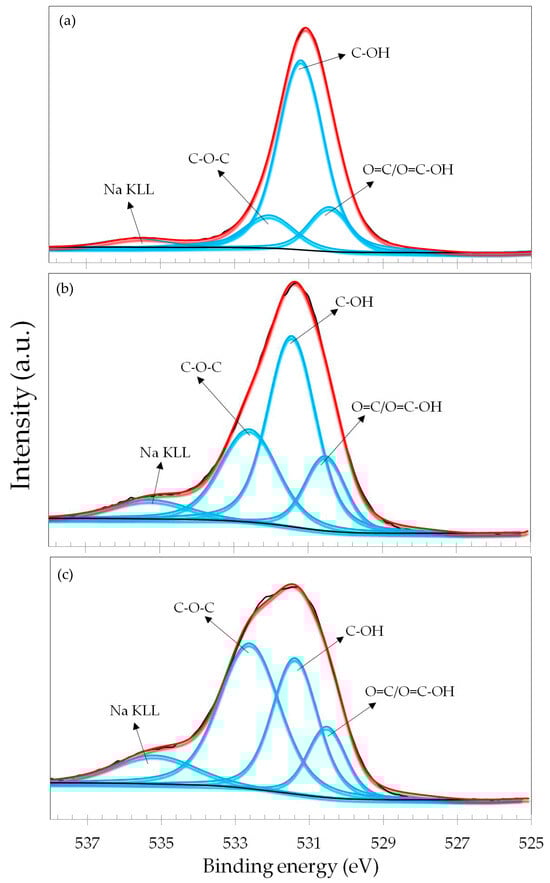The O 1s spectrum of the 0.1% 4 h sample is displayed in Figure 6b. It was deconvoluted with three components assigned to O=C/O=C-OH, C-OH, and C-O-C bonds, in good agreement with other reports for the O 1s photoelectron line of graphene oxide [,]. The O 1s spectrum of the GO sample (Figure 8b) exhibited the same components. However, if one considers the other GO-coated samples, one additional feature was observed. As shown in Figure 7, besides the three components already mentioned above for the pure GO and 0.1% 4 h samples, one additional peak was encountered at approximately 535 eV. This peak was due to an Auger peak of sodium (Na KLL), as reported in the literature []. Sodium species originate from the NaOH pretreatment of the AZ91D substrate to enhance its interaction with the intermediate APTES layer before GO deposition. Thus, the presence of such a peak in the O 1s spectrum suggests that the GO layer is less defective on the 0.1% 4 h sample when compared to the other GO-coated samples, as it did not display the Na KLL peak. In fact, the surface morphology of 0.1% 4 h (Figure 2e) indicated that it exhibited the best surface coverage and less-defective topography among the GO-coated samples. Yet, it is interesting to note that the intensity of the Na KLL peak decreases as the GO concentration and deposition time increased (see the evolution of the Na KLL intensity from Figure 7c to Figure 7a), thus indicating that the coverage of the NaOH-treated AZ91D substrate was gradually improved. Furthermore, as evident in Figure 7, the relative area of the peak assigned to hydroxyl bonds (C-OH) increased with the GO concentration and immersion time. These bonds are typical functional groups present in the basal planes of GO []. Hence, its increased relative fraction in the 0.1% 2 h sample (Figure 7a) with respect to the samples obtained at a GO concentration of 0.05% (Figure 7b,c) suggests an increased coverage of the substrate with the GO film.