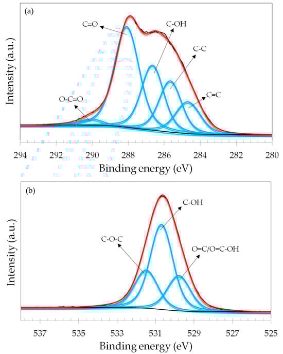 The C 1s spectrum of the 0.1% 4 h sample (Figure 6a) was deconvoluted with five peaks, in accordance with the literature for the XPS results of graphene oxide, showing its typical functional groups [,,]. The same components were also observed for the C 1s photoelectron lines of the other GO-coated samples, as shown in Figure S2 (Supplementary Materials). A pure GO sample was also analyzed using XPS, and its C 1s spectrum is shown in Figure 8a. The same components were also observed. They were assigned to C=C (284.4 eV), C-C (285.4 eV), C-OH (286.4 eV), C=O (288.0 eV), and O-C=O (290.0 eV) bonds of the GO coating on the surface of the AZ91D substrate.