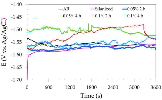 Before the EIS measurements, the open circuit potential (OCP) was monitored for 3600 s. The results are shown in Figure 10. The AR condition presented a gradual decrease in the OCP with time, which is likely associated with the non-protective nature of the naturally formed corrosion film on the surface of the AZ91D electrode []. When compared to the AR condition, the silanized sample exhibited a sharp increase in the very beginning of the monitoring period, followed by a gradual ascending trend up to the end of the test, without significant fluctuations. All GO-coated samples also showed an ascending trend, which was less pronounced for the 0.05% 2 h condition. The OCP was shifted to nobler values for the other GO-coated samples [], suggesting a decrease in the electrochemical activity of the AZ91D substrate, depending on the GO concentration.