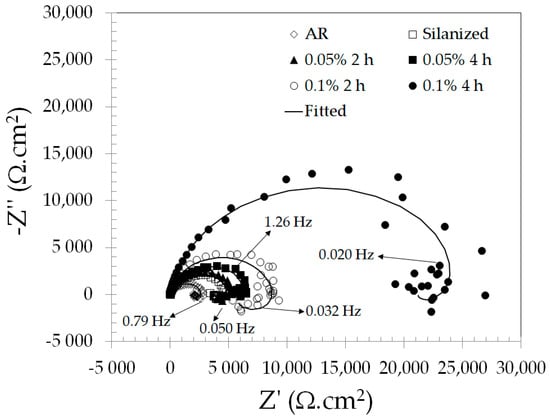 Nyquist plots of the AR, silanized, and GO-coated AZ91D samples are shown in Figure 11. The results were obtained after 1 h of immersion in 3.5 wt.% NaCl solution at room temperature. The AR sample (uncoated AZ91D) exhibited a depressed capacitive loop in the high- to medium-frequency domain, followed by an inductive loop at the lowest frequencies. The silanized (without GO coating) and GO-coated samples displayed similar behavior. The smallest capacitive loop diameter was observed for the uncoated AZ91D alloy. The diameter of the capacitive loop is associated with the corrosion resistance of the electrode surface, being related to its charge in transfer resistance [,]. The best corrosion resistance was, therefore, observed for the 0.01% 4 h sample, which displayed the highest impedance values and the largest capacitive loop. Furthermore, two additional features can be noticed from Figure 11. The first one is related to the deposition time: (i) the corrosion resistance was gradually decreased when the deposition time was reduced at the same GO concentration. The second one refers to the effect of GO concentration: (ii) the corrosion resistance increased, as the GO concentration was raised from 0.05% to 0.1% at the same deposition time.