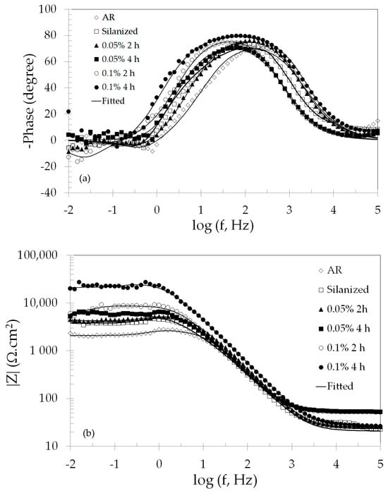 The EIS response of the AZ91D samples can be further evaluated from the Bode plots shown in Figure 12. As seen in Figure 12a, the phase angle plot of the AR condition is characterized by one peak, whose maximum reaches an angle of approximately −71°. The phase angle dropped off below 100 Hz, indicating the onset of corrosion processes. The capacitive response was improved for the silanized sample, as the phase angle peak was shifted to a slightly higher value and dropped off only at lower frequencies. The GO-coated samples displayed more capacitive response with respect to the silanized one, as inferred from the increase in the maximum phase angle that reached up to −80° for the 0.1% 4 h sample. Furthermore, the peak plateau widened for the GO-coated samples when compared to AR, suggesting that one additional time constant can be superimposed. One additional feature is that the phase angles dropped off at lower frequencies for the GO-coated samples, indicating its superior capacitive response and higher corrosion resistance. This is confirmed by the results shown in the |Z| vs. log f plots in Figure 12b. The impedance magnitude at 0.01 Hz is often employed as a measure of the corrosion resistance of the electrode [,].