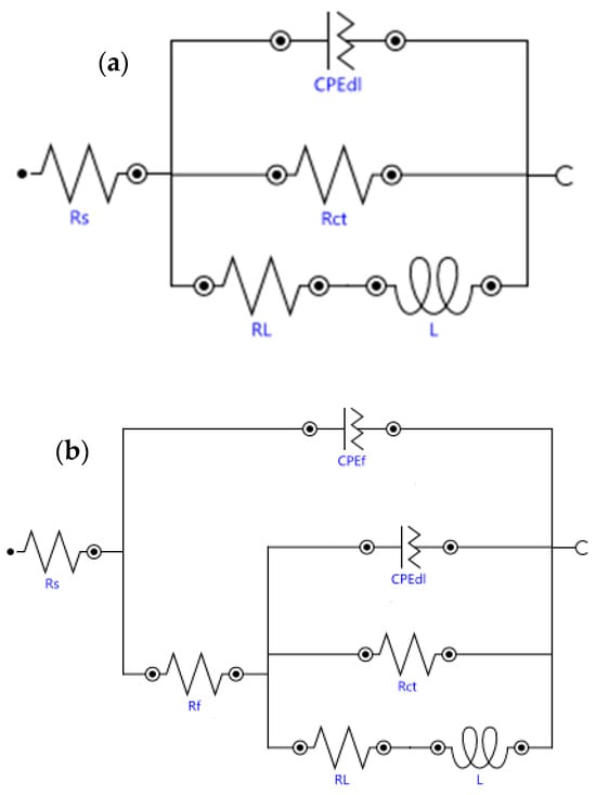In order to give a quantitative interpretation of the EIS results, equivalent electrical circuits (EECs) were employed to simulate the experimental data. Two different EECs were used to fit the experimental results, as seen in Figure 13. Constant phase elements (CPE) were used instead of pure capacitors due to the heterogeneous nature of the electrode surface []. The impedance of a CPE (ZCPE) is expressed as shown in Equation (6), where Q is the CPE magnitude, j is the complex operator, ω is the angular frequency, and n is the CPE exponent (varies between 0 and 1, depending on the capacitive response) [,].