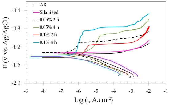 Electrochemical parameters obtained from the potentiodynamic polarization curves shown in Figure 14.