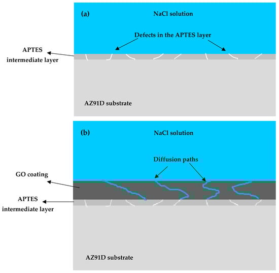 Illustration of the corrosion protection mechanism of the AZ91D samples: (a) silanized; (b) GO-coated samples.