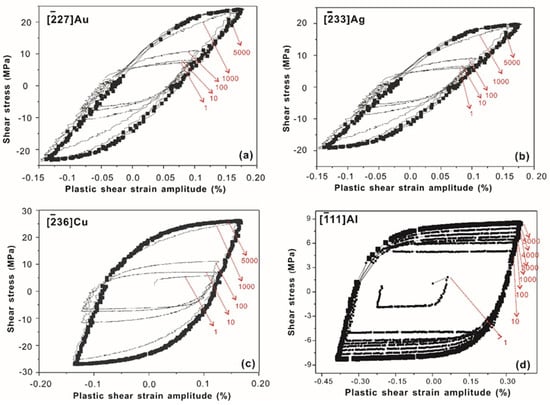 Figure 1 exhibits the hysteresis loops of various FCC single crystals. The [ 2 ¯ 27 ] -oriented Au single crystal and the [ 2 ¯ 33 ] -oriented Ag single crystal show similar hysteresis loops from the first cycle to the 5000th cycle, with their shear stress increasing with the number of cycles. That is primarily due to work hardening mechanisms, dislocation interactions and the formation of dislocation structures that resist further deformation. At cyclic saturation, the saturation stresses of the Au and Ag single crystals are 23.4 MPa and 20 MPa, respectively. In comparison, the [ 2 ¯ 36 ] Cu single crystal has a larger hysteresis loop area at cyclic saturation, with a saturated shear stress of approximately 26.9 MPa. Notably different from the Au, Ag and Cu single crystals, the [ 1 ¯ 11 ] Al single crystal exhibits a minimum saturation stress of only 8.5 MPa at high plastic strain amplitude. In addition to elements, the crystallographic orientation significantly impacts the hysteresis loop of FCC single crystals.