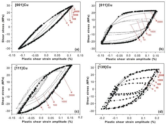 Figure 2. Comparison on the hysteresis loops of fatigued Cu single crystals with specific orientations. (a) [ 001 ] ; (b) [ 011 ] ; (c) [ 1 ¯ 11 ] ; (d) [ 1 ¯ 39 ] .
