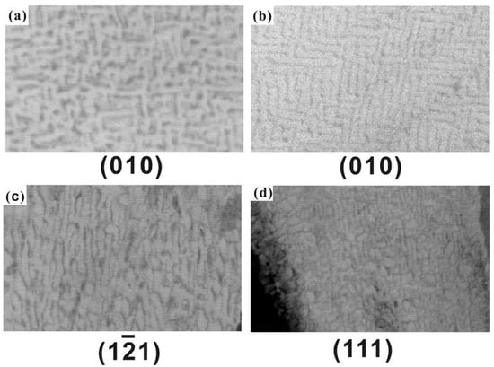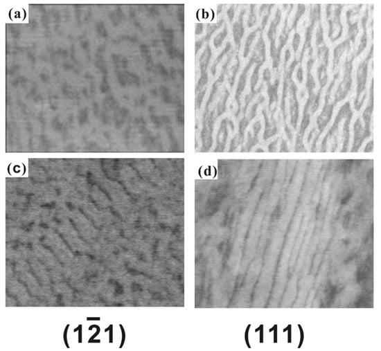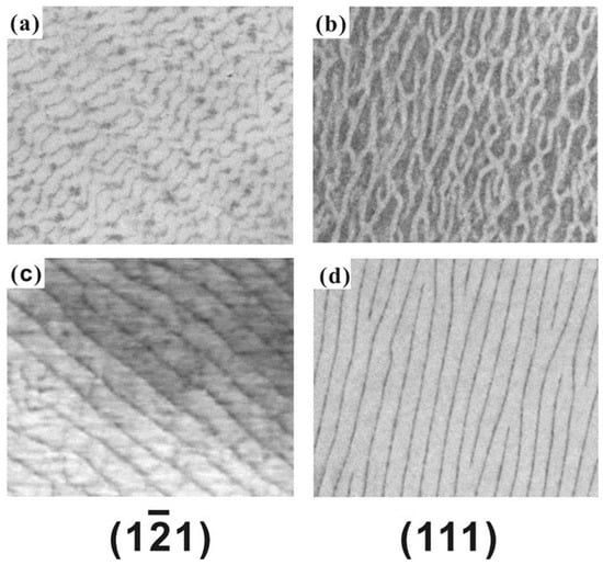 Figure 8. Dislocation configurations from different observed planes. (a,c) Labyrinth and cell structures on plane ( 1 2 ¯ 1 ) ; (b,d) labyrinth and cell structures on plane ( 111 ) .