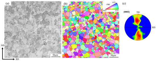 In this experiment, a commercially pure titanium tube of grade II was used, with a composition of C-0.08%, Fe-0.25 wt%, H-0.025 wt%, N-0.03 wt%, O-0.05 wt%, and balance Ti and dimensions of Φ50 mm × 6 mm. The initial microstructure of the titanium tube is shown in Figure 3. Figure 3a presents the optical microstructure (OM) of the tube billet before rolling, where the grains are equiaxed, reflecting the typical annealed microstructure without twinning. Figure 3b,c show the EBSD inverse pole figure (EBSD-IPF) and pole figure of the tube billet, respectively. It can be observed that the c-axes of most grains are tilted from the transverse direction (TD) towards the normal direction (ND), indicating a noticeable rotated transverse texture. The samples for microscopic inspection were taken from the rolling plane (RD-ND) of the tube billet and the rolled tube. After polishing and corrosion, the samples were observed under Leica DMi8 optical microscopy (Leica Microsystems, Wetzlar, Germany). The samples after electrolytic polishing were subjected to EBSD detection under a Thermo Fisher Scientific scanning electron microscope (Thermo Fisher Scientific, Waltham, MA, USA) equipped with an EDAX detector (AMETEK EDAX Inc, Pleasanton, CA, USA). The acceleration voltage and working distance were set to 20 kV and 15 mm, respectively, to collect crystallographic information with a step size of 0.5 μm. Subsequently, the microstructure characteristics were analyzed using OIM software (version of 7.2).