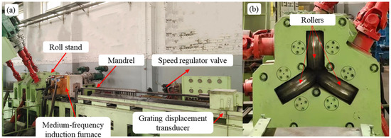 The titanium tubes were experimentally tested using a continuous retained-mandrel rolling mill developed by the research group. Figure 4a shows an overall view of the rolling mill, where the mandrel is driven by a hydraulic cart. The speed of the mandrel can be manually adjusted via a regulator valve, and the cart is equipped with a grating displacement transducer. After calculation by a plc program, the mandrel speed can be computed in real time, enabling precise control of the mandrel speed. The induction heating furnace heats the titanium tubes online, reducing heat loss during the insertion of the mandrel and the transfer of the tube to the rolling mill. Figure 4b shows a rear view of the rolling mill, illustrating that the rollers are arranged at an angle of 120 degrees to each other and are driven by three separate DC motors. Additionally, to reduce speed fluctuations of the three motors under load within the same stand, a motor-speed synchronization control program was incorporated into the motor control system.