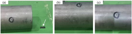To better observe the distribution of shear deformation in the thickness direction, a direct macroscopic observation model was designed, following the method used for observing deformation in asymmetric rolling, which involves internal metal implantation [21]. To prepare the sample for this design, a 1 mm hole was first punched through the tube billet. A titanium wire (indicated by the arrow) was then cut to the thickness of the tube, as shown in Figure 5a. This wire was inserted into the tube billet with a transitional fit, as illustrated in Figure 5b. Figure 5c shows the inserted tube sample. Finally, rolling experiments with various mandrel speeds were conducted at a reduction ratio of 30%, as excessive reduction rates would make it difficult to distinguish the implanted wire from the matrix.