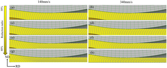 The mesh geometry at the groove vertex under mandrel velocities of (a,c,e,g) 140 mm/s and (b,d,f,h) 340 mm/s to a reduction ratio of (a,b) 10%, (c,d) 20%, (e,f) 30%, and (g,h) 40%.