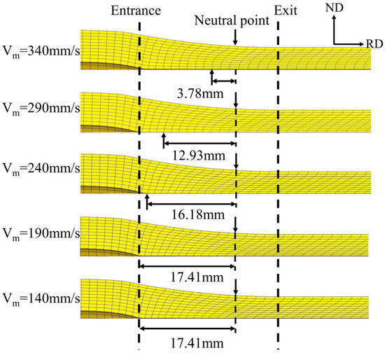 The speed difference between the roll and the mandrel in the CRR process inevitably leads to the formation of a cross-shear zone, which plays a crucial role in shear strain, rolling force, and grain refinement during rolling [22]. Figure 7 shows the positions of the neutral points of the roll and the mandrel (indicated by the arrows), as well as the cross-shear zone of the tube under different mandrel speeds. It can be observed that as the mandrel speed decreases, the neutral point on the mandrel side continuously shifts towards the rolling entrance, while the neutral point of the roll shows no significant change. This differs somewhat from asymmetric rolling in plate materials due to the low friction coefficient between the mandrel and the tube, which prevents deformation on the inner wall of the tube from effectively penetrating the outer wall. When the mandrel speed is 190 mm/s, the neutral point of the mandrel no longer lies within the rolling deformation zone; in other words, from the rolling entrance to the neutral point of the roll, the titanium tube remains in the cross-shear zone, with the zone size reaching 17.41 mm at this point. Furthermore, as the mandrel speed continues to decrease, the neutral point on the roll side does not move towards the exit, so the width of the cross-shear zone remains unchanged.