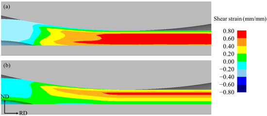 Some studies have indicated that shear deformation is a primary factor in grain refinement [23,24]. In this paper, shear strain is used as the evaluation criterion to investigate the effect of hot rolling deformation on grain refinement in tubes. Figure 8 presents the shear strain distribution at the groove vertex of the tube under different mandrel speeds during the rolling process. It is observed that the shear strain on the inner and outer surfaces is lower compared to the central layer. This finding aligns with Serajzadeh’s research on hot-rolled strips [25], which suggests that temperature differences result in less mesh distortion on the inner and outer walls compared to the central layer. Additionally, under slow mandrel conditions, shear strain is uniformly distributed across the thickness direction of the tube, whereas, under fast mandrel conditions, the shear strain is predominantly concentrated on the outer wall, which is consistent with the observed mesh deformation pattern.