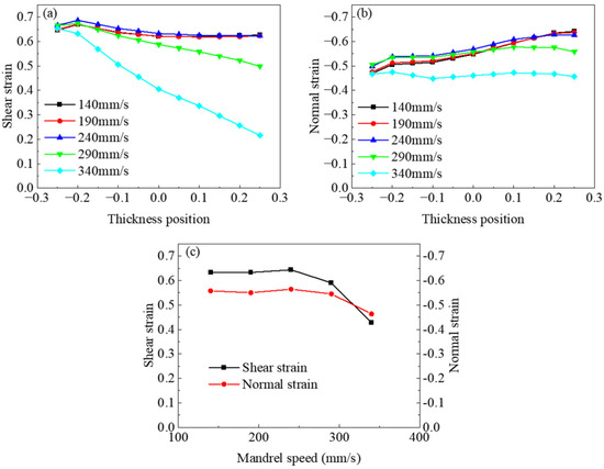 To avoid the influence of surface-chilling effects, the region selected for studying the effect of mandrel speed on strain at the groove vertex was constrained to −0.25 (near the inner wall) < m < 0.25 (near the outer wall), as shown in Figure 8. When the mandrel speed is 340 mm/s, the shear strain is concentrated on the outer wall side and gradually decreases along the thickness direction, reaching 0.21 near the inner wall. This results in a non-uniform distribution of shear strain in the thickness direction of the tube. In contrast, at slower mandrel speeds, the shear strain distribution in the thickness direction of the tube is relatively uniform, with the inner-wall shear strain averaging around 0.63. Regarding radial compressive strain, the mandrel speed has little to no effect on it.