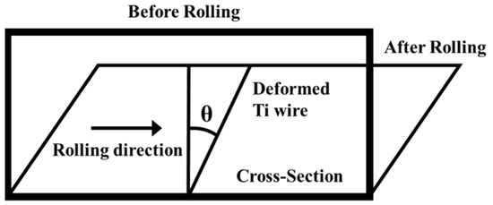 In order to better quantify the impact of mandrel speed on the shear deformation of titanium tubes, this study uses the angle between the deformed wire after rolling and the normal direction of the tube to represent the degree of shear deformation, which is referred to as the shear angle. The schematic diagram of this shear angle is shown in Figure 11 below.