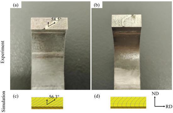 Figure 12 shows the deformation state of the wire in the ND-RD surface after rolling at different mandrel speeds. The deformation of the inserted wire in the direction of the entire thickness of the tube can be clearly seen. When the mandrel speed is 340 mm/s, the shape of the inserted wire is similar to the horizontal projectile motion curve, and the inclination degree of the wire decreases gradually from the outer wall to the inner wall, where the wire at the inner wall is almost not inclined, indicating that the shear deformation degree at the inner wall is low when the mandrel speed is high. When the mandrel speed is 140 mm/s, the shape of the inserted wire can be regarded as a straight line tilted from the ND to the RD, indicating that the tube has strong shear deformation in the entire thickness direction. In addition, compared with the results of the finite element simulation and experiment, it can be seen that the deformation degree of the finite element mesh is almost the same as that of the inserted wire in the experiment. The average shear angle of the finite element mesh and the implanted wire in the slow mandrel rolling is 56.3° and 58.5°, respectively. The error is less than 4%, indicating that the simulation results are highly reliable.