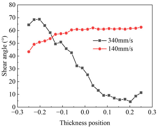 In order to measure the inclination angle of the inserted wire more accurately, a rectangular coordinate system with the RD as the X-axis and the ND as the Y-axis was established, and a point was taken along the thickness direction of the wire at a distance of 0.1 mm to measure its value. Figure 13 shows the distribution of the shear angle along the thickness direction, and the position of the point is taken from the near outer wall to the near inner wall. It can be found that the shear angle of the slow mandrel rolling along the thickness direction is almost greater than that of the fast mandrel rolling, but there is an exception on the near outer wall side. When the mandrel speed is 140 mm/s, the shear angle from the near outer wall to the near inner wall first increases to a certain value and then remains unchanged, while when the mandrel speed is 340 mm/s, the shear angle first decreases to 4.2° and then rises. The last rise in the shear angle may be caused by incomplete lubrication of the mandrel during actual operation.