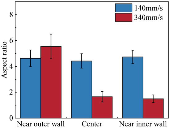 Figure 15 illustrates the quantitative evolution of the grain aspect ratio (the ratio of the long axis to the short axis) in the thickness direction at the groove vertex under different mandrel speeds. When the mandrel speed is 340 mm/s, the grain aspect ratio decreases from the near outer wall to the near inner wall. However, during slow mandrel rolling, the grain aspect ratio of the titanium tube is uniformly distributed across the thickness direction. Additionally, the grain aspect ratio at the outer surface of the titanium tube after fast mandrel rolling is 5.54, which is slightly higher than the grain aspect ratio of 4.62 under slow mandrel rolling. However, considering the entire thickness direction, the average grain aspect ratio under the fast mandrel process is lower than that under the slow mandrel process. This suggests that the slow mandrel process results in a more uniform microstructure at the groove vertex of the rolled tube, which means more stable mechanical properties, so it is recommended to appropriately reduce the mandrel speed in industry production.