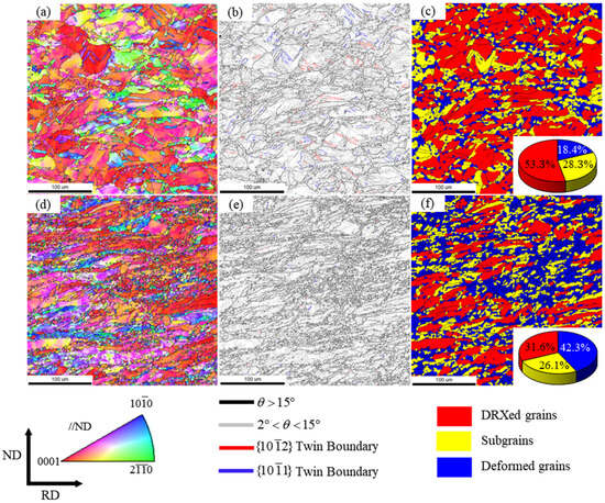 To obtain a higher volume fraction of recrystallized grains, rolling experiments were conducted at a 40% reduction ratio. Figure 16 presents the orientation imaging analysis of the near inner wall of the titanium tube after rolling at 750 °C under different mandrel speeds. Figure 16a,d display the EBSD inverse pole figures (EBSD-IPF), while Figure 16b,e show the grain boundary maps. In these maps, low-angle grain boundaries (LAGBs, 2°–15°) are indicated by gray lines, and high-angle grain boundaries (HAGBs, >15°) are represented by black lines. The tensile twins and compressive twins are marked in red and blue, respectively. The grain orientation spread (GOS) method was employed to statistically analyze the volume fraction of dynamic recrystallization (DRX). The minimum angle was defined to categorize the grains into recrystallized grains (2°), subgrains (5°), and deformed grains [28], which correspond to the blue, yellow, and red regions in Figure 16c,f, respectively.