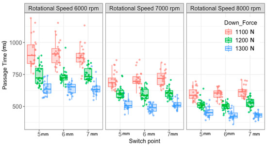 To learn more about the data, they were plotted based on the three variables. As shown from the three-column sections in Figure 4, the passage time decreases significantly as the rational speed increases from 6000 rpm to 8000 rpm. The color differences reflect the data from different levels of downforce; the passage time decreases as the downforce increases from 1100 N to 1300 N, while other conditions stay the same. According to the data pattern from Figure 4, the data does not show a significant change regarding the different levels of switch points.