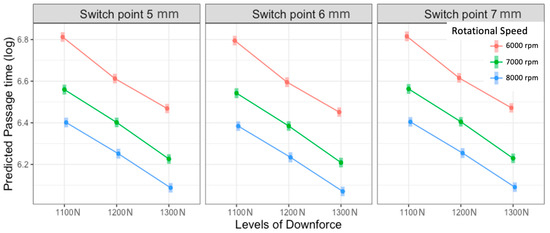 According to the results of the multiple linear-regression model (Table 4), higher rotational speed and greater downforce are associated with shorter passage time, while changes in switch points do not significantly affect passage time; in addition, the interaction between rationale speed 8000 rpm with 1200 N downforce slightly increases the passage time. Specifically, compared to the base level of rotational speed (6000 rpm), rotational speed 7000 rpm (coef. = −0.25; p < 0.01; d = −1.10) showed a negative impact on the passage time; similarly, a rotational speed of 8000 rpm is associated with a greater negative impact on passage time (coef. = −0.42; p < 0.01; d = −1.87). However, the effect of rotational speed on passage time depended on the level of downforce and vice versa. Table 4 suggests that the interaction between rotational speeds at 8000 rpm and 1200 N downforce significantly affects passage time (coef. = 0.05; p = 0.02). Therefore, a three-way interaction plot was made, as shown in Figure 5, indicating that the interactions between an 8000 rpm rotational speed and 1200 N downforce positively affected passage time. In terms of downforce, compared to the base level of downforce (1100 N), 1200 N downforce (coef. = −0.20; p < 0.01; d = −0.90) and 1300 N downforce (coef. = −0.35; p < 0.01; d = −1.54) were identified as significant variables in decreasing the passage time. In contrast, the results from multiple linear regressions suggested that the level changes in the switch point are insignificant for the passage of time. In addition, following the Tukey pairwise showed significant differences between each rotational speed level, each downforce level, and different pairwise treatment combinations of rotational speed and downforce, but the Tukey pairwise test did not detect any significant difference between different levels of switch points, which is consistent with the results from the multiple linear-regression model.
