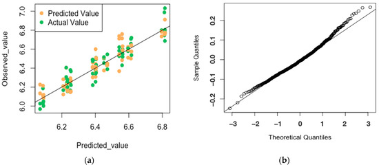 (a) Predicated vs. actual values, (b) QQ plot—normality check.
