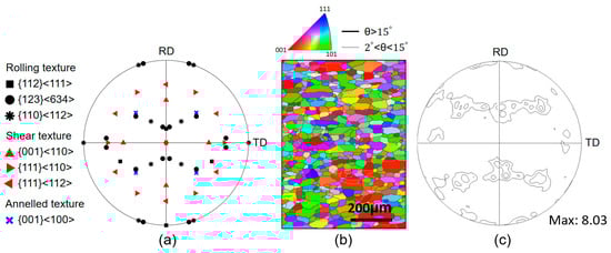 (a) Pole figures shows positions of shear-type and rolling-type textures. (b) IPF EBSD maps, and (c) pole figure of starting material.