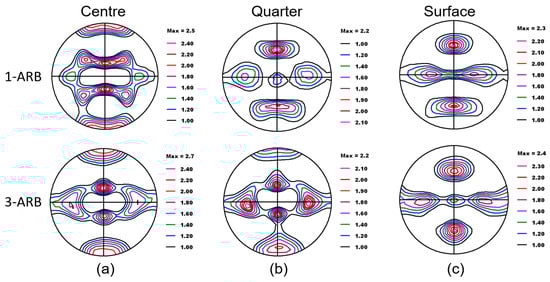 XRD characterized texture at (a) center, (b) quarter, (c) surface after 1-ARB and 3-ARB.
