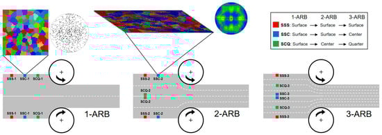 One of the most effective processing methods to fabricate ultrafine-grained metals is accumulative roll-bonding (ARB) [,,,,,,]. In ARB processes, two sheets are stacked after surface treatment, and then roll-bonding is applied. The roll-bonded sheet is cut into two parts prior to the subsequent cycle. The four steps (surface treatment, stacking, roll-bonding, and cutting) involved in each cycle can be repeated up to a potentially unlimited number of cycles []. This cutting–stacking pattern of ARB results in a characteristic through-thickness strain and, accordingly, textural features.