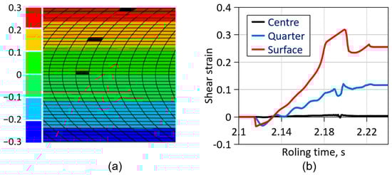 Figure 4a shows the deformed FEM mesh after 1-ARB, and Figure 4b presents the shear strain history at the center, quarter, and surface, as marked by the black squares in Figure 4a. The deformation at the center was compression, as the shear strain is very low in Figure 4b. The FEM mesh was severely sheared at the surface and thus resulted in a high shear strain. In Figure 4b, the increase in the shear strain at ~2.12 s was due to the tilt of the sheet when entering the rolling bite, and the decrease in the shear strain at ~2.20 s was due to the direction change in the relative slide between the sheet and rollers when passing the neutral point.