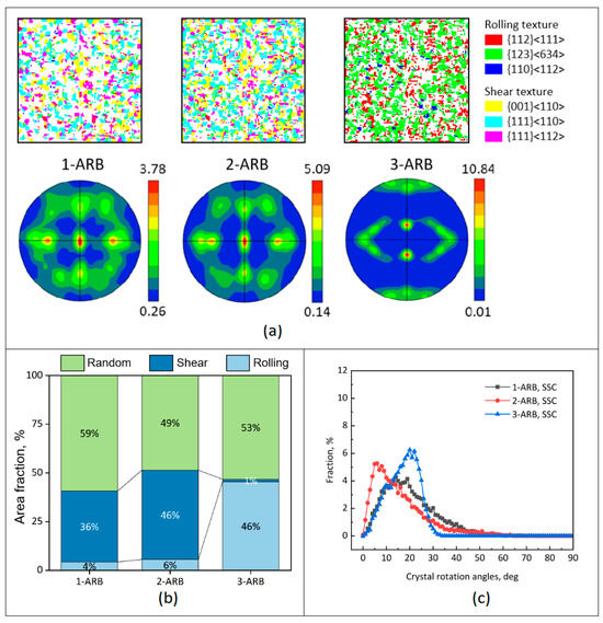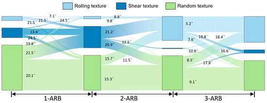 During 3-ARB, the texture transition was mainly between the rolling and random textures (Figure 9) with small rotation angles. The formed shear texture during 3-ARB was mainly from the rolling texture and secondarily from the random texture (Figure 9), and the formation of the shear texture was accompanied by large rotation angles. In contrast, the formation of the rolling texture was relatively slow (Figure 8 and Figure 9), which is consistent with the findings in Ref. []. An obvious textural transition between the random and rolling textures was observed though the area fraction of the rolling texture during 3-ARB was almost unchanged, which was unexpected.