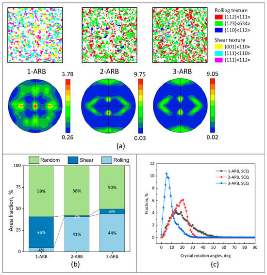 The surface region in 1-ARB was moved to the center in 2-ARB (SCQ). During 2-ARB, the destruction of the shear texture was almost complete, which was demonstrated by the change in area fraction (Figure 9); the shear texture was destroyed quickly (Figure 8). The destroyed shear texture (formed in 1-ARB) rotated into a rolling and random texture (Figure 9), and thus, the formation of the rolling texture was also quick. In this ARB cycle, the area fraction of the random texture was further reduced, and the destroyed random texture mainly changed into a rolling texture. The rolling texture was almost preserved (Figure 9) by small rotation angles (Figure 8).