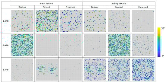 Figure 5, Figure 6 and Figure 7 clearly reveal the textural transition between the shear-type and rolling-type textures along the three different paths. The developed texture stayed stable if the region was located at the same position along the thickness (e.g., along the SSS path), while the previously evolved texture became unstable if the position was changed (e.g., along the SCQ path). According to the history of shear strain at the surface, quarter, and center (Figure 4), the change in the shear strain resulted in a textural transition. In the following, the behaviors of the texture transition along the SCQ path are discussed. Figure 8 shows the distribution of formed, preserved, and destroyed shear textures and rolling textures during these three cycles, as well as the crystal rotation angles during the texture transition. Figure 9 shows the change in area fraction between shear, rolling, and random textures, as well as the average rotation angles between these textural transitions.