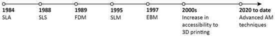 The fundamental historical milestones for the development of 3D printing machines are listed below and schematically summarized in Figure 1 [5,6,7,8,9]: