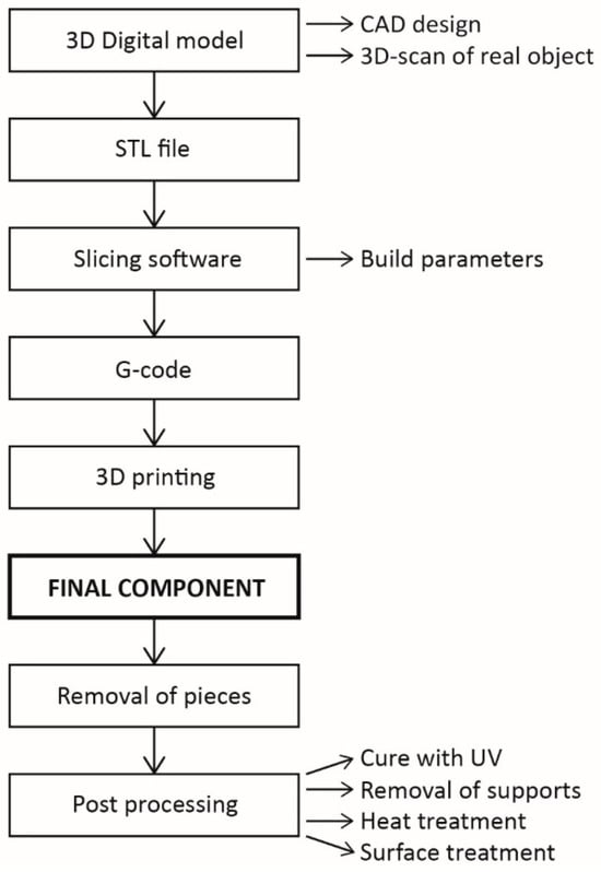 It is possible to identify a general sequence of eight fundamental steps, schematically summarized in Figure 2 [12], for the production of a component using AM technology from design to final part, regardless of the additive manufacturing technique selected.