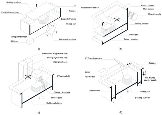 Schematic representations of different types of printers: (a) SLA printer; (b) FDM printer; (c) MJ printer; (d) SLS printer.