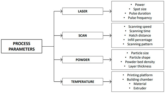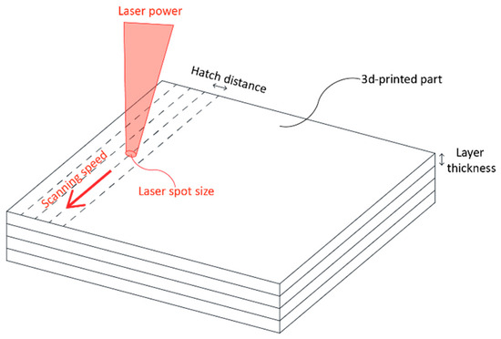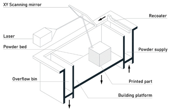 The main applications of SLM involve the production of parts where high accuracy and high customisation are required. SLM is widely employed in the medical and dental industry, as well as in the aerospace and automotive sectors [44]. A schematic representation of the SLM process is shown in Figure 7.