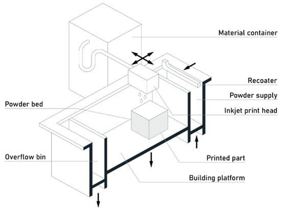 The limited cost and production rate make BJ ideal for the development of casting models that would be hard to achieve with traditional methods. The principles of the binder jetting BJ printing process can be seen in Figure 8.