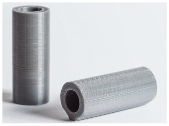 FDM is a process based on the extrusion of remelted material to generate the subsequent layers of the three-dimensional object [22,26]. The materials used in this type of technology are mainly polymers, but there are also some variants that use other materials such as ceramic pastes. The polymers are supplied as wire spools, continuously bringing material to the extruder (moved by computer control), which allows the extrusion of filaments through the nozzle, heating the material to melting. The nozzle moves according to the layout of the final object to be produced, releasing melted material that cools and solidifies generating each layer. After finishing a layer, the build plate is lowered and the process is continued layer by layer until the 3D part is built [27,28].