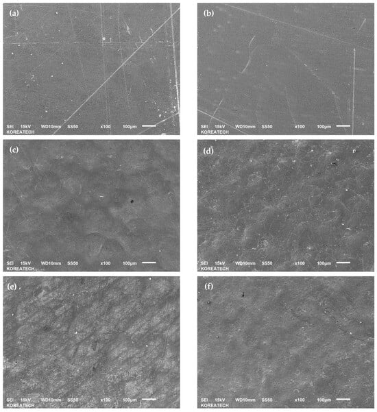 The surface roughness of the specimens was measured using a Mitutoyo SurfTest SJ-210 portable 2D profilometer (Kawasaki, Japan) with a scanning speed of 0.5 mm/s for 4.8 mm at a measuring force of 0.75 mN. The radius of the diamond stylus tip is 2 µm. Surface roughness measurements were made in accordance with the ISO standard, and the presented definition refers to the DIN standard.