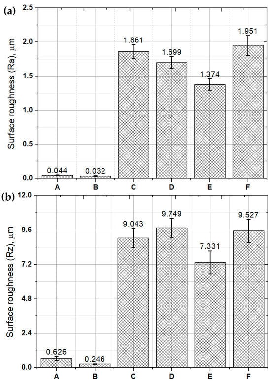 Surface roughness (Ra) (a) and Rz (b) measurement results of the control (A), QT heat treatment (B), SP before baking heat treatment (C), Cr-plating and baking heat treatment (D), stripping after Cr-plating and baking heat treatment (E) and re-SP after Cr-plating (F) specimens.