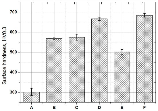 Surface microhardness measurement results of the control (A), QT heat treatment (B), SP before baking heat treatment (C), Cr-plating and baking heat treatment (D), stripping after Cr-plating and baking heat treatment (E) and re-SP after Cr-plating (F) specimens.