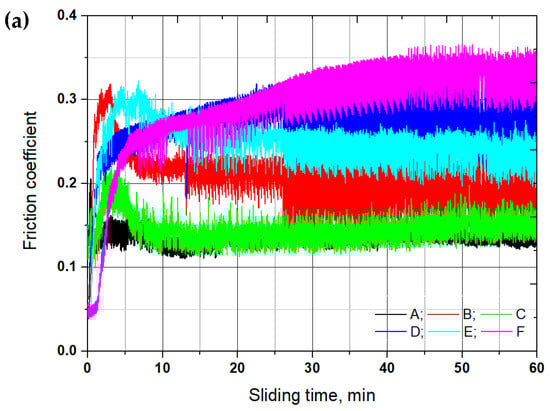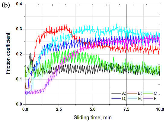 Variation of friction coefficient (a) and initial 10-min friction data (b) of the control (A), QT heat treatment (B), SP before baking heat treatment (C), Cr-plating and baking heat treatment (D), stripping after Cr-plating and baking heat treatment (E) and re-SP after Cr-plating (F) specimens.