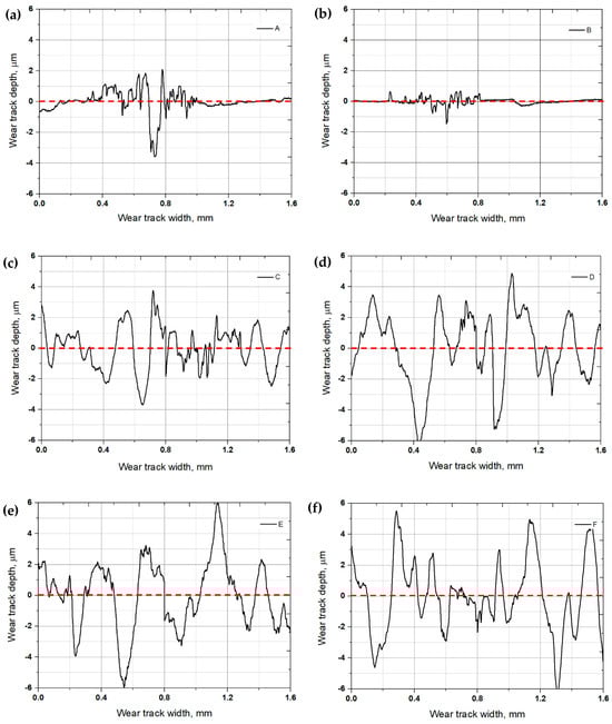 Cross-sectional wear track profiles of the control (a), QT heat treatment (b), SP before baking heat treatment (c), Cr-plating and baking heat treatment (d), Stripping after Cr-plating and baking heat treatment (e) and re-SP after Cr-plating (f) specimens.